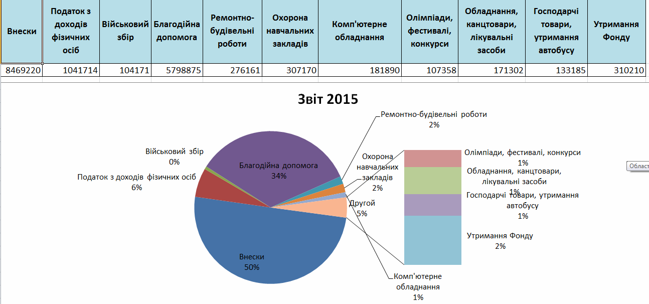 За звітний період надходження благодійних внесків становило 8 469 220 грн. Так у 2015 році більш ніж значна частина коштів, а саме 82 % від надходження благодійних внесків, пішла на забезпечення фінансової підтримки вчительства, вихователів та адміністративно-господарському персоналу.