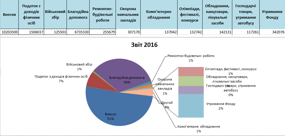 За звітний період надходження благодійних внесків становило 10 203 500 грн.Так у 2016 році більш ніж значна частина коштів, а саме 82 % від надходження благодійних внесків, пішла на забезпечення фінансової підтримки вчительства, вихователів та адміністративно-господарського персоналу.