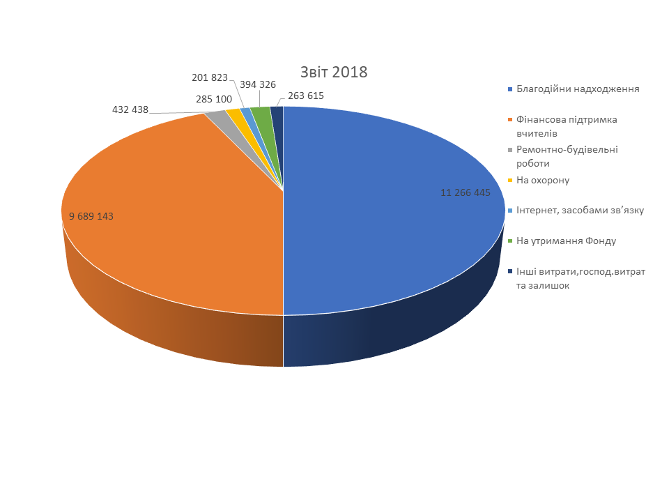 За звітний період надходження благодійних внесків становило 11 266 445 грн. Так у 2018 році більш ніж значна частина коштів, а саме 86 % від надходження благодійних внесків, пішла на забезпечення фінансової підтримки вчительства, вихователів та адміністративно-господарського персоналу.