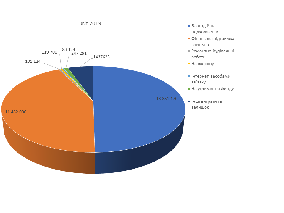 За звітний період надходження благодійних внесків становить 13 351 170 грн. Так у 2019 році значна частина коштів, а саме 86 % від надходження благодійних внесків, пішла на забезпечення фінансової підтримки вчителів, вихователів та адміністративно-господарського персоналу.