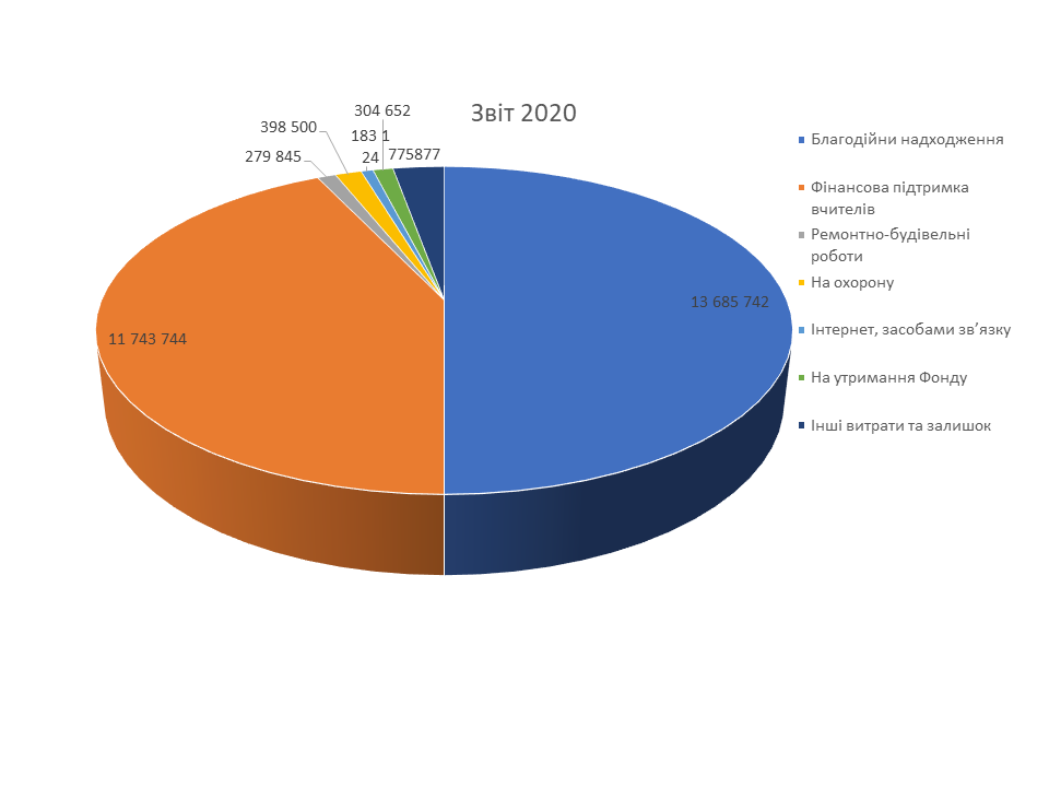 За звітний період надходження благодійних внесків становить 13 685 742 грн. У 2020 році значна частина коштів, а саме 86 % від надходження благодійних внесків, пішла на забезпечення фінансової підтримки вчителів, вихователів та адміністративно-господарського персоналу.
