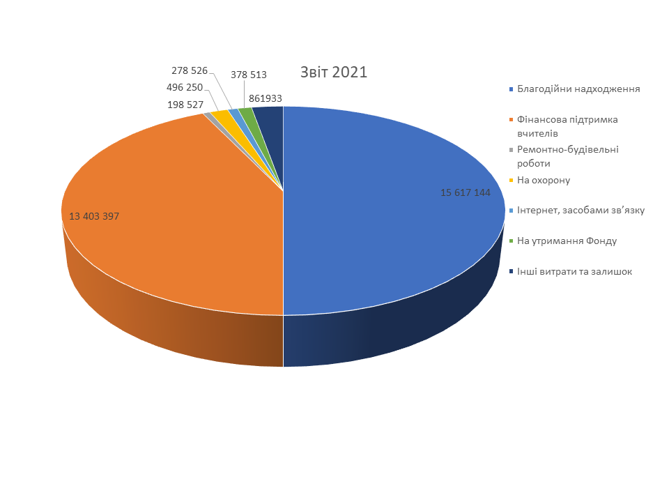 За звітний період надходження благодійних внесків становить 15 617 144 грн. У 2021 році значна частина коштів, а саме 86 % від надходження благодійних внесків, пішла на забезпечення фінансової підтримки вчителів, вихователів та адміністративно-господарського персоналу.