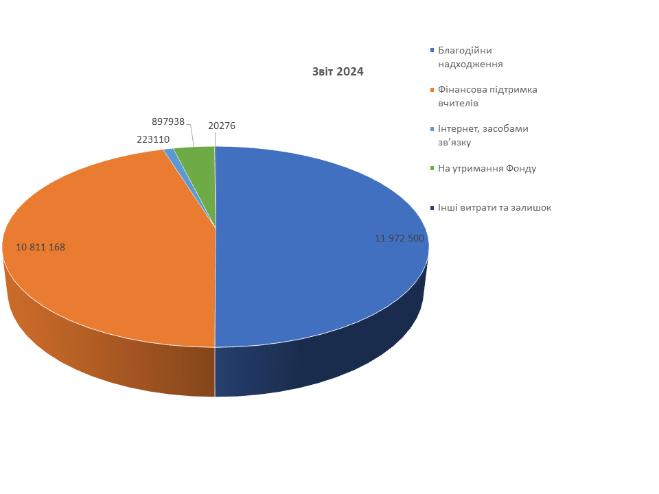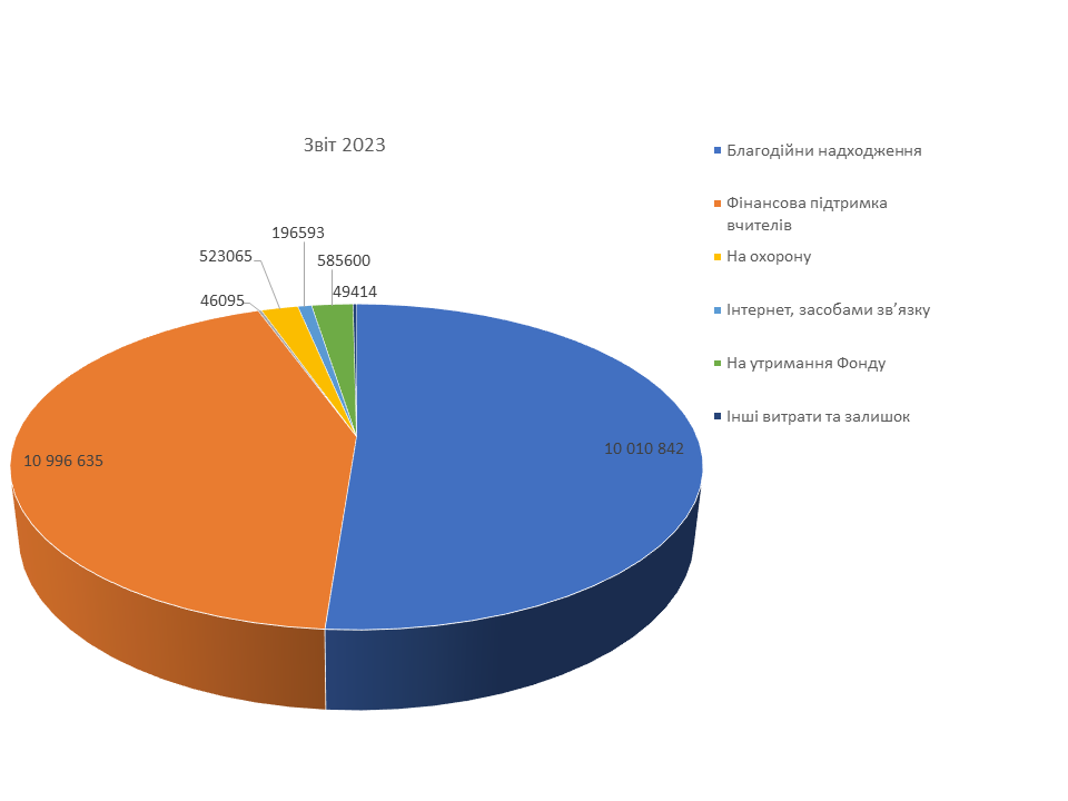 За звітний період надходження благодійних внесків становили 13 010 842 грн. У 2023 році значна частина коштів, а саме 84,5 % від надходження благодійних внесків, пішла на забезпечення фінансової підтримки вчителів, вихователів та адміністративно-господарського персоналу.